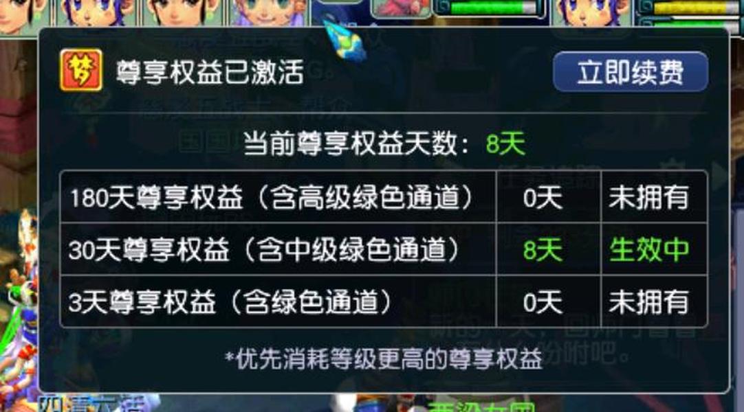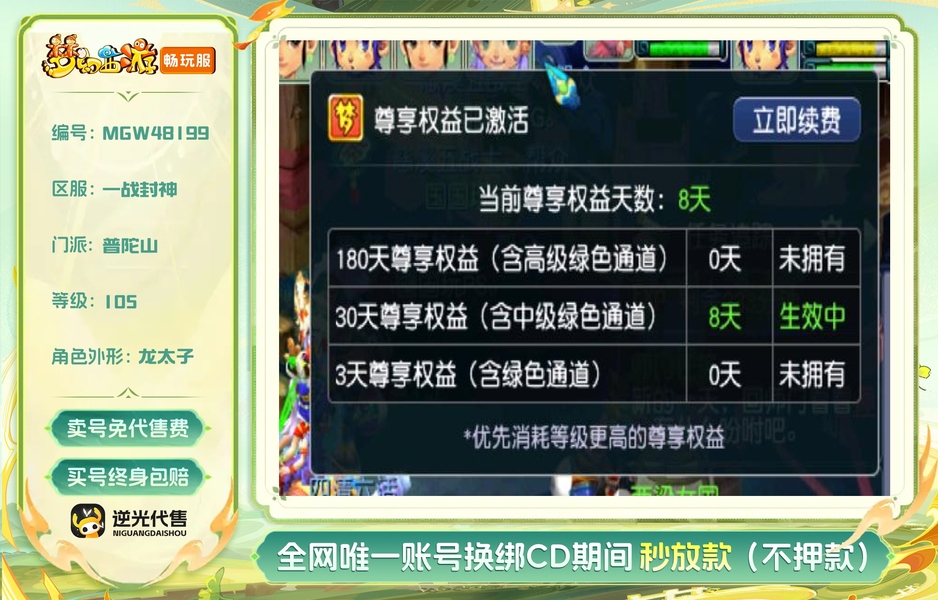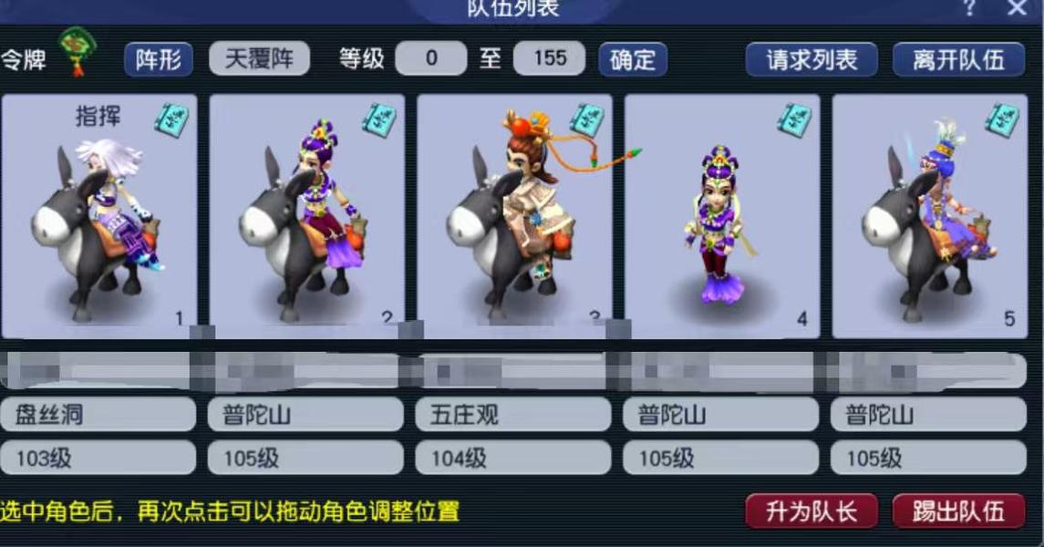 一组105 1ps 1wz 3pt 一个540+4个90绿通 90还剩8天 540剩128天 系统送的宝宝都有100多级 技能90多 不到100 队长带天阵
