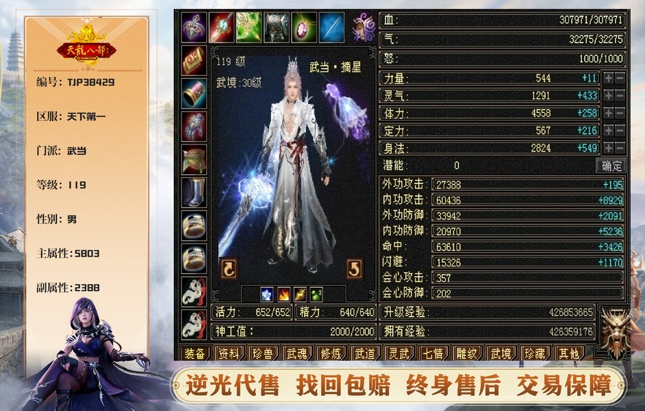 【TJP38429】 | 武当 | 等级:119 | 主属性:5803 | 副属性:2388 | 男 | 主冰攻 | VIP4 | 畅游账号