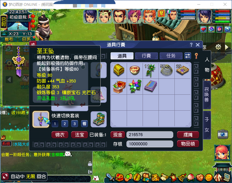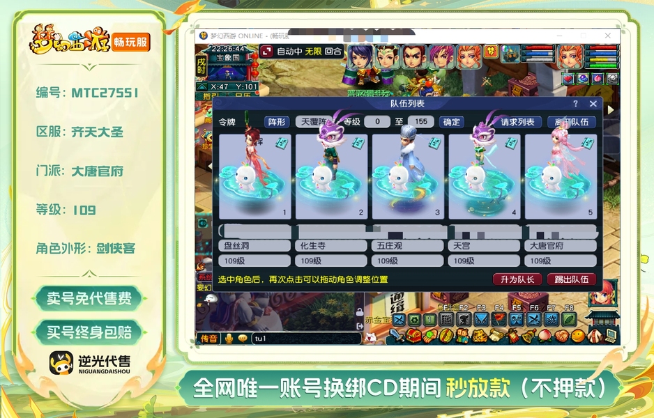 逆光购买,齐天大圣5门(另外建业城有3个占坑号),有锦衣,有天阵,有坐骑,有攻宝宝,有耐卡,底子不错。图上的宝宝装备都带着。新续费绿通。还有绑定仙玉。细节看图就行。