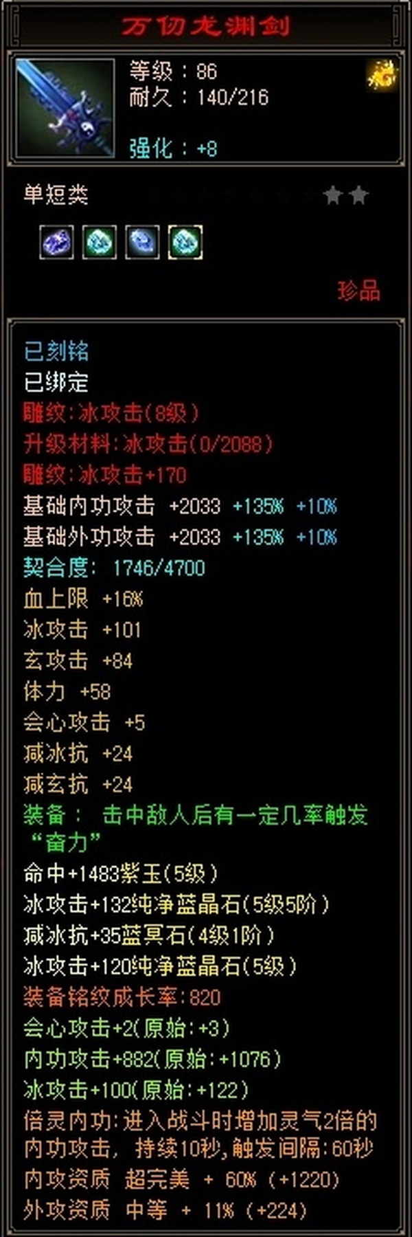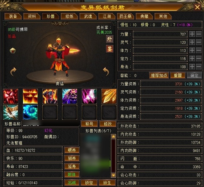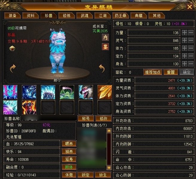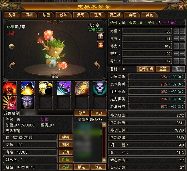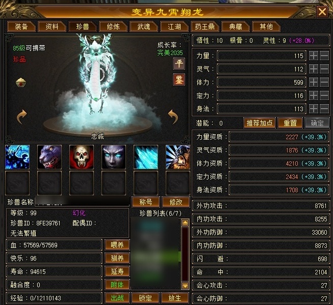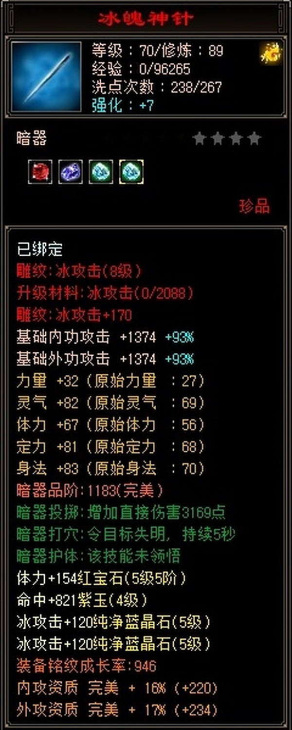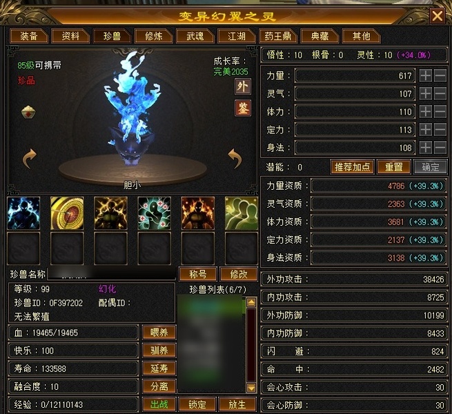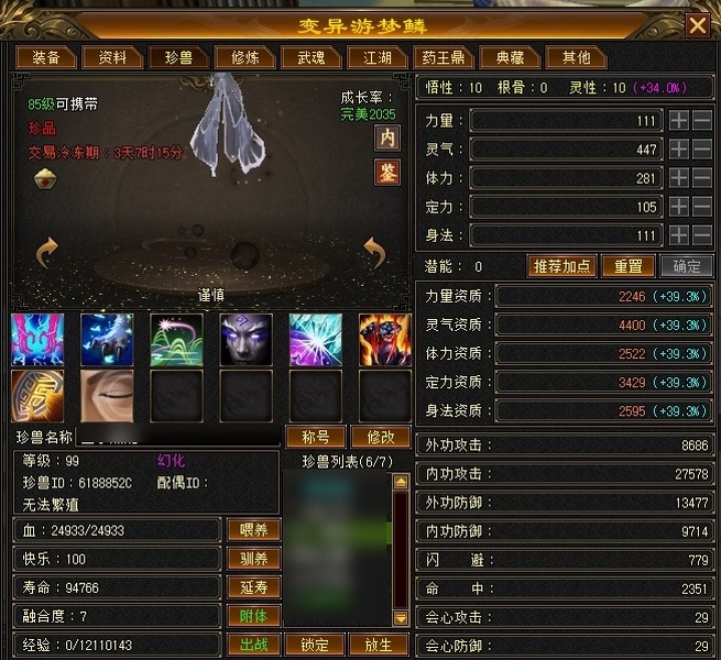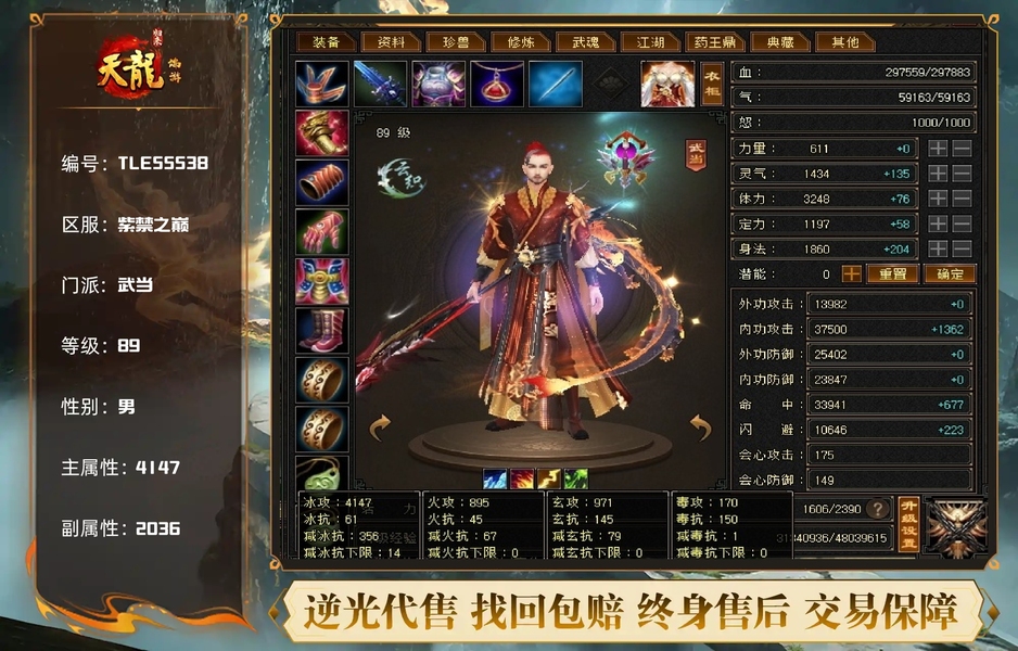 冰火玄内功四修武当,主属性4124,有效属性6000+,6只成品宝宝,装备全毕业,两个半8雕,满充值号,副本打架伤害没毛病