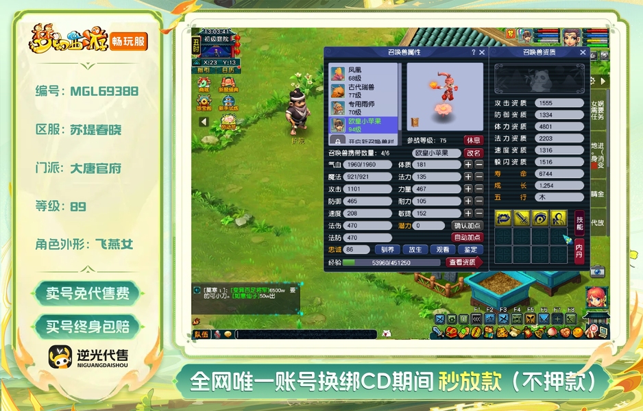 【MGL69388】 | 总经验:21122万 | 等级:89 | 大唐官府 | 无换绑CD | 30天尊享特权 | 女 | 【逆光代售卖号0手续费】【买号找回永久包赔】