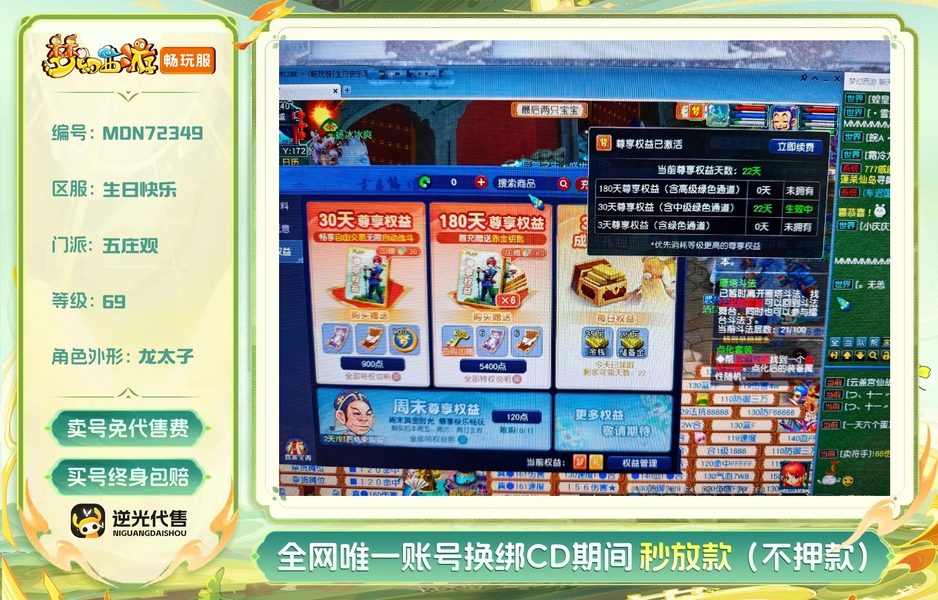 90+60还有21天,号上还有3.5亿经验可直升109,装备5逆鳞套,仓库都没清的大概还有1000万吧,因工作原因玩不了了,看上的直接拍,绝不会找回