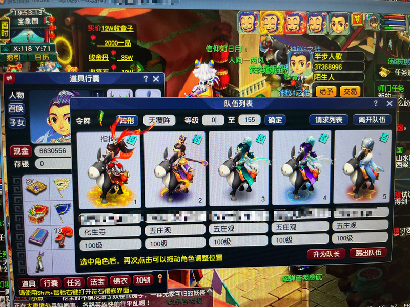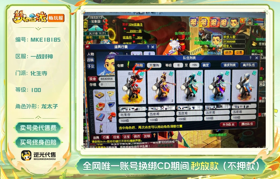 精品5开,1化生4五庄,装备齐全 可刷所有难度,五庄参照照片,同修同装备,都是高伤100级武器,带一组满资by芙蓉,一组成品耐卡,2紫气豪宅,锦衣每个号都有,小灰驴和飞行祥瑞每个号都有,jn每个号100级 ,高修炼,队长号为化生,带天阵鸟阵