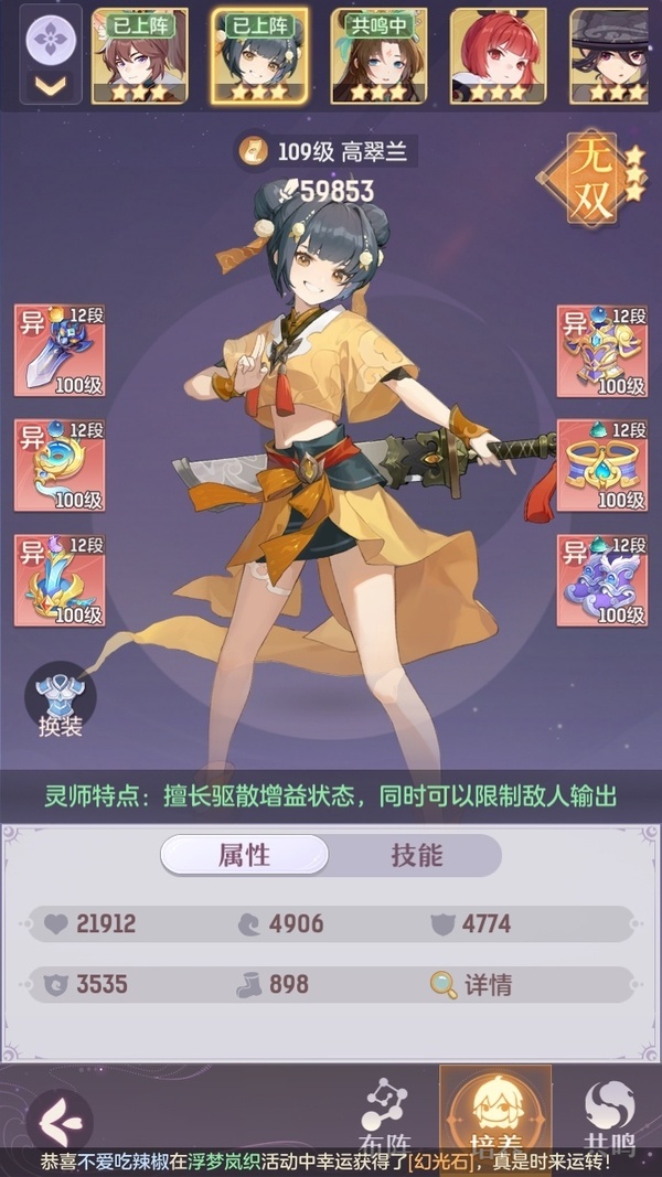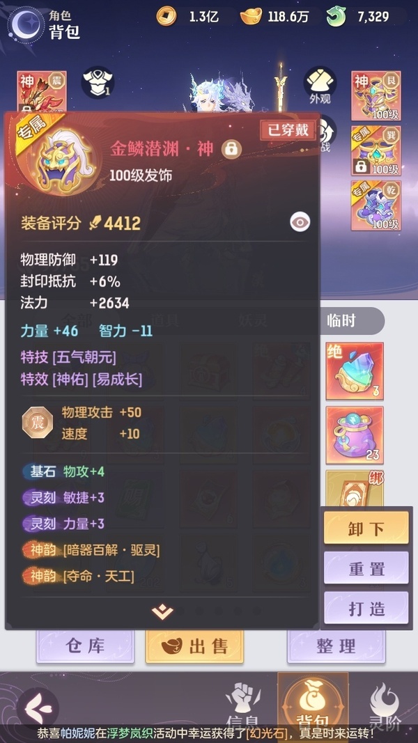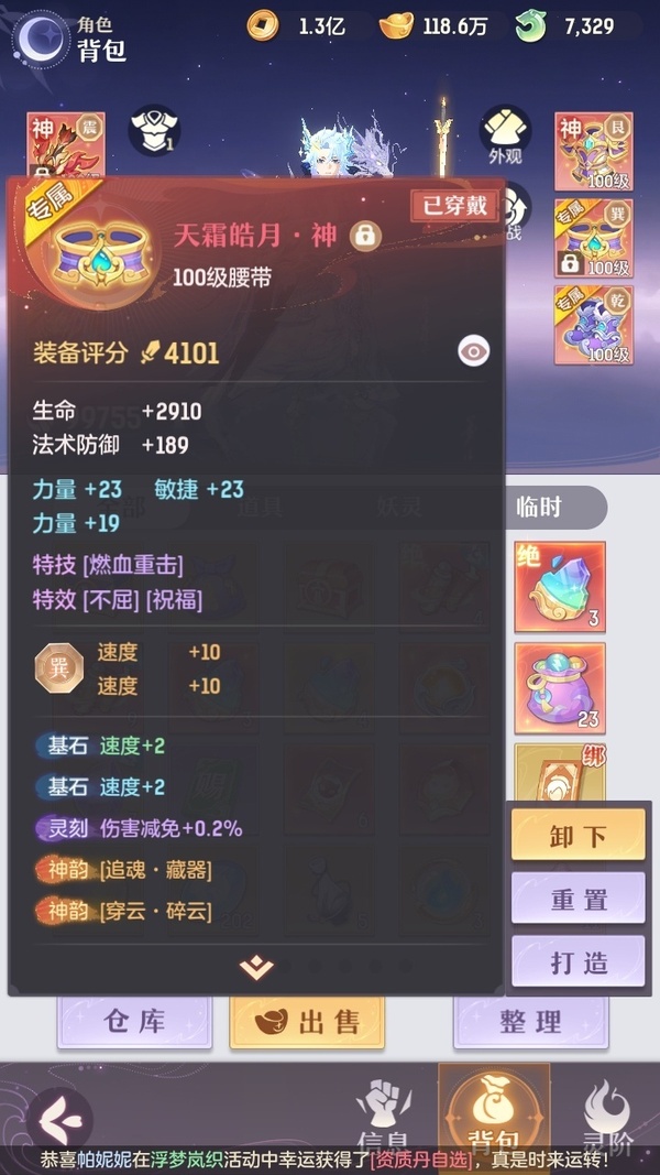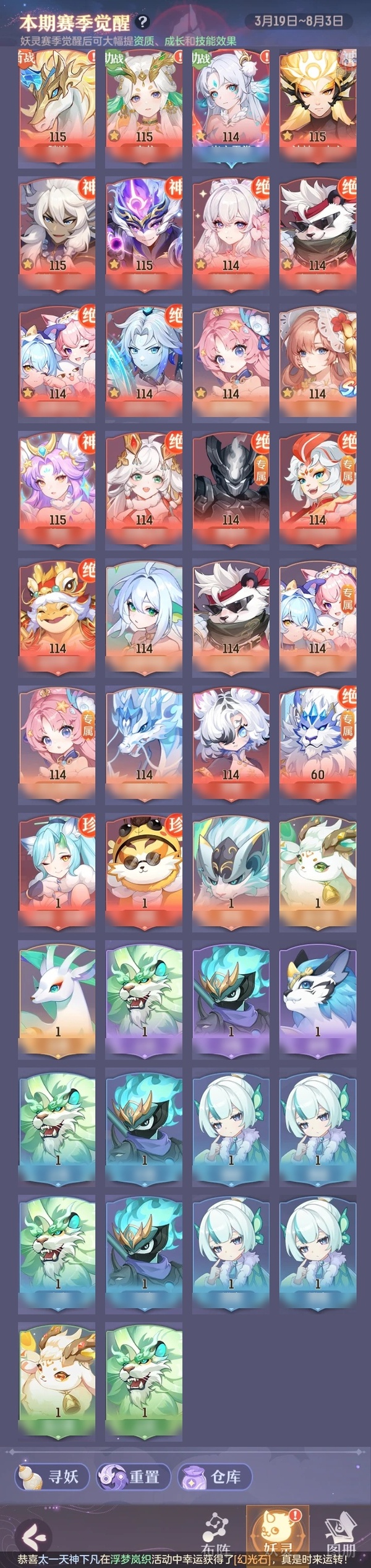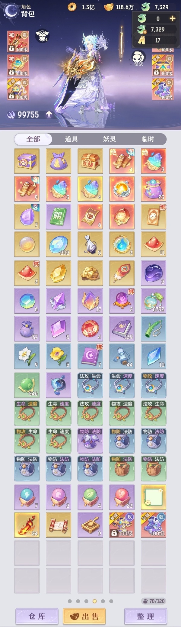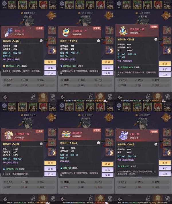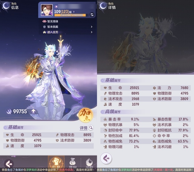颜值:22949 | 等级:109 | 唐门 | 神兽数:6 | 法宝颜色统计:10红0蓝 | 总评分:442870 | 角色评分:99755 | 妖灵评分:224098 | 灵师评分:119017 | 倾天三 | 织梦星海,淬金曜蚀,乘波踏浪,山君现,清寒羽冽,灵鸢一梦,墨染尘烟,星河揽月,离火苍龙,玉兔月赏,九春韶华,火树银花,哈?我当武器?,炙烤大串,碎梦语情,一刹雷鸣 | 蝶恋芳菲,火神·赤曦 | 乌蹄·照夜,祥云,太一驴,钱多多,蟹有钳,七彩灵鲲,星昀渡,比翼同舆,万海真君,罗帷七香车,蕴灵天剑,浪起来,血蚀苍牙,飞起来·壹号,负山海,跃龙门,鸭与云游,喵小萌,飞天笔,红莲·出尘,飞龙在天,兔球,大荒之主,风火乾坤,海月璃梦,贯日神君,祥云·虹光,焚天火凤,花将军,招财进喵,初弦瑶桂,乘风入梦,狐心入梦,风驰电掣,踏火焚夜,凤蝶·梦浮生,逍遥羊 | 【买号找回永久包赔】