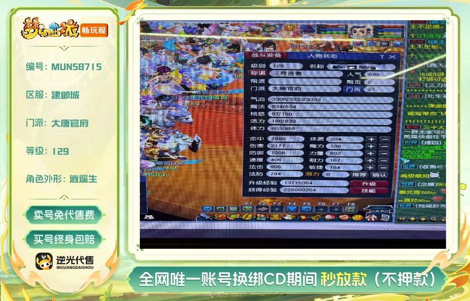 总经验:140000万 | 等级:129 | 大唐官府 | 无换绑CD | 180天尊享特权 | 男 | 【逆光代售卖号0手续费】【买号找回永久包赔】