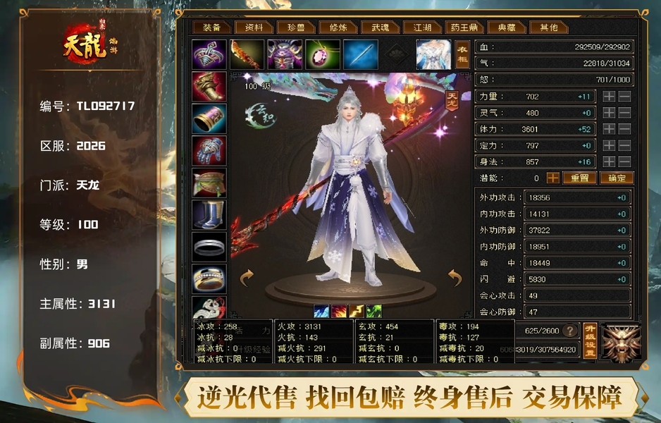 【TLO92717】 | 天龙 | 等级:100 | 主属性:3131 | 副属性:906 | 男 | 主火攻