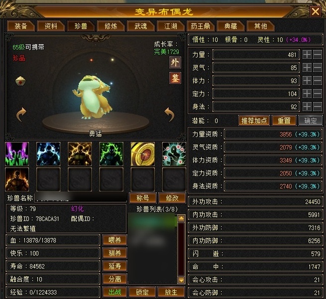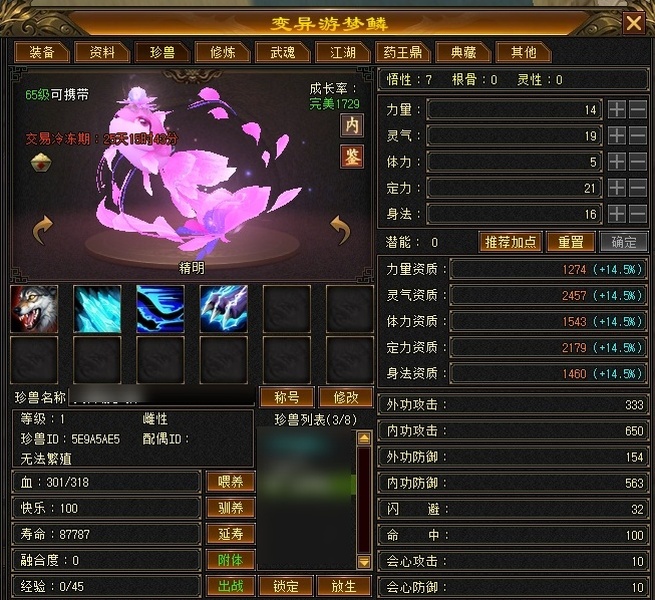 双排5属5体,裸面板主属性3257,26万血,有附体,成品出战宝宝,两个天减雕文,可刷一切活动,满级鼎,野外图鉴差个黄龙府毕业,接手不用投资直接养老!持续更新中