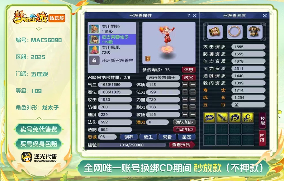 【MAC56090】 | 等级:109 | 五庄观,普陀山 | 存在换绑CD | 30天尊享特权 | 男 | 【逆光代售卖号0手续费】【买号找回永久包赔】