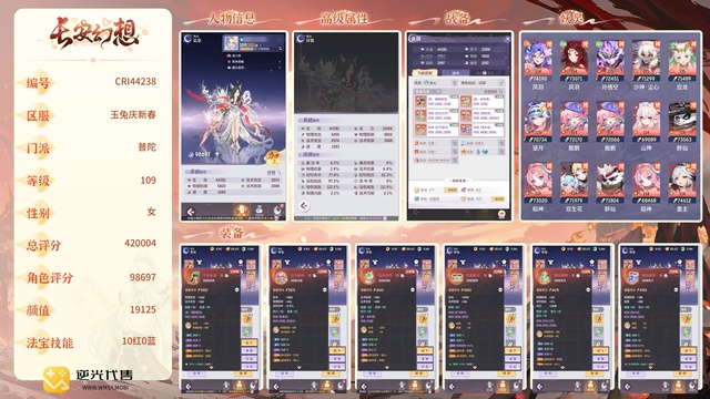 【CRI44238】 | 角色评分:98697 | 等级:109 | 神兽数:4 | 颜值:19125 | 法宝颜色统计:10红0蓝 | 普陀 | 蝶恋芳菲 | 离火苍龙、淬金曜蚀、织梦星海、玉兔月赏、九春韶华、乘波踏浪、山君现、清寒羽冽、碎梦语情、灵鸢一梦、墨染尘烟、星河揽月 | 飞天笔、祥云、兔球、风火乾坤、吾皇·萌骑、海月璃梦、气球派对、钱多多、灵华引、万海真君、焚天火凤、通明心剑、初弦瑶桂、招财进喵、乘风入梦、云心漫游、负山海、风驰电掣、踏火焚夜、凤蝶·梦浮生、跃龙门、柯冲冲、喵小萌 | 陈平安、望月、山神、应龙、稻神、沙神·尘心、鲲鹏、烛龙、瑞兽、凤羽、苍辰、墨主、帝炎、剑魂、醉仙、通灵熊、梦姑、琥狮、天犬、白泽、玄鹤、灵兔、雨师、双生花、孙悟空、旋龟