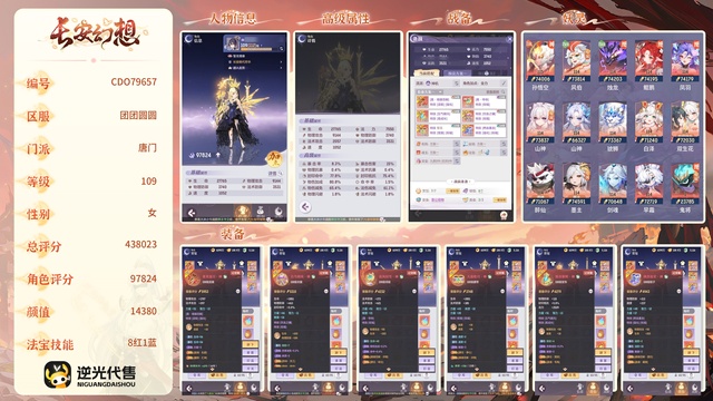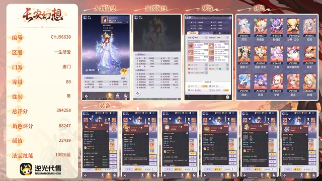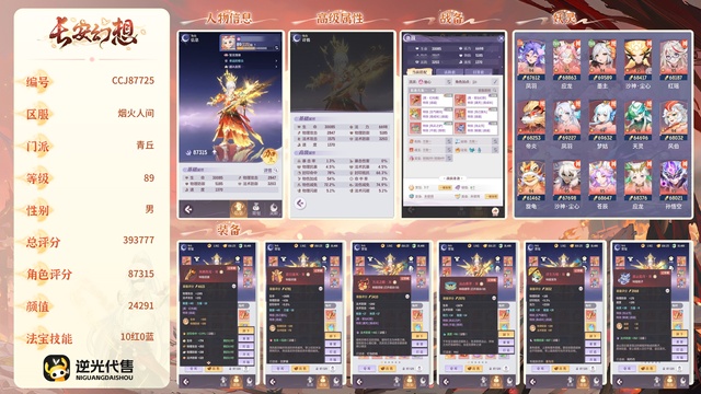 颜值:22439 | 等级:89 | 唐门 | 神兽数:8 | 法宝颜色统计:10红0蓝 | 总评分:394258 | 角色评分:88247 | 妖灵评分:206284 | 灵师评分:99727 | 倾天三 | 淬金曜蚀,织梦星海,乘波踏浪,山君现,清寒羽冽,灵鸢一梦,星河揽月,离火苍龙,九春韶华,火树银花,哈?我当武器?,碎梦语情,炙烤大串,一刹雷鸣 | 凤凰游 | 乌蹄·照夜,太一驴,吾皇·萌骑,钱多多,气球派对,灵华引,比翼同舆,万海真君,蕴灵天剑,云心漫游,浪起来,飞起来·壹号,负山海,跃龙门,鸭与云游,飞天笔,飞龙在天,红莲·出尘,兔球,风火乾坤,大荒之主,锦纱丹凤,贯日神君,玄夜星羚,祥云·虹光,花将军,招财进喵,初弦瑶桂,乘风入梦,鼠鼠·星愿巫,狐心入梦,风驰电掣,踏火焚夜,凤蝶·梦浮生,柯冲冲 | 【买号找回永久包赔】