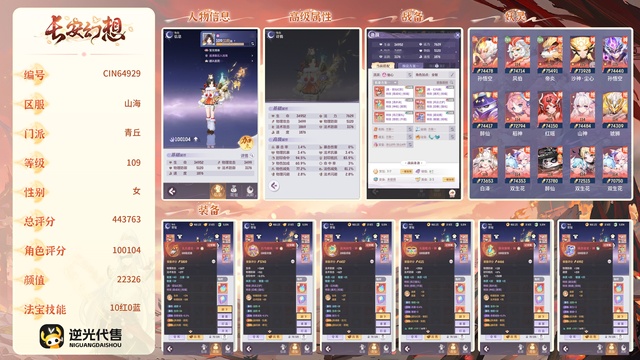 颜值:22326 | 等级:109 | 青丘 | 神兽数:4 | 法宝颜色统计:10红0蓝 | 总评分:443763 | 角色评分:100104 | 妖灵评分:224683 | 灵师评分:118976 | 倾天三 | 淬金曜蚀,织梦星海,乘波踏浪,山君现,清寒羽冽,灵鸢一梦,墨染尘烟,星河揽月,离火苍龙,九春韶华,玉兔月赏,火树银花,哈?我当武器?,碎梦语情,炙烤大串,一刹雷鸣 | 蝶恋芳菲 | 乌蹄·照夜,祥云,蟹有钳,钱多多,气球派对,灵华引,星昀渡,比翼同舆,万海真君,罗帷七香车,蕴灵天剑,浪起来,飞起来·壹号,负山海,北域霜枭,跃龙门,鸭与云游,飞龙在天,红莲·出尘,兔球,风火乾坤,大荒之主,海月璃梦,锦纱丹凤,贯日神君,玄夜星羚,花将军,招财进喵,初弦瑶桂,乘风入梦,狐心入梦,风驰电掣,踏火焚夜,凤蝶·梦浮生,逍遥羊,柯冲冲 | 【买号找回永久包赔】