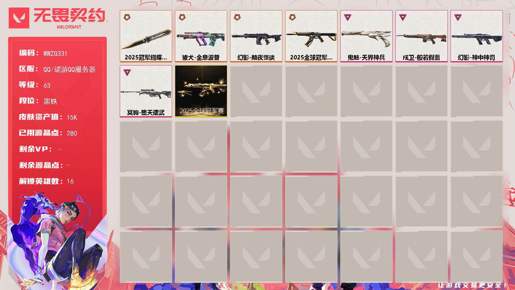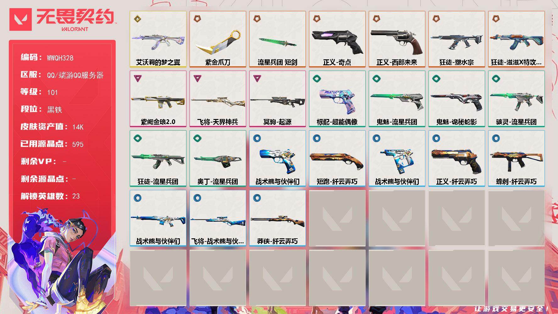 皮肤资产价值:105300 | 定海神珍,超限闪存匕首,诡秘蛇影军刀,镭切,魔术火花,侦察力量蝴蝶刀,机动狂飙战刀,2025全球冠军赛蝴蝶刀,荒土机兵热能刀,日耀风暴遗器,离子武器2.0爪刀,无畏契约季前邀请赛悲悯之刃,澄湖潋滟,神罚2.0战锤 | 奇点幻影,混沌序曲2.0幻影,纳米打击幻影,超限闪存幻影,侦察力量幻影,奇幻朋克3.0幻影,神圣领域幻影,归零者2.0幻影,末日之翼幻影,掠影2.0幻影 | 奇幻朋克3.0狂徒,上古龙炎狂徒,紫阙金琅狂徒,2025全球冠军赛狂徒,偃月苍龙狂徒,光荣异象狂徒,堕天遗武狂徒,机动狂飙狂徒,混沌序曲狂徒,艾沃莉的梦之翼狂徒,RGX11zPro狂徒,光明哨兵狂徒,诡秘蛇影狂徒,滋滋X特攻队狂徒,塑水宗狂徒,日冕雄师狂徒,魄月玄兔狂徒,荒土机兵狂徒,创·纪元狂徒,掠影狂徒 | 奇点正义,创·纪元正义,纳米打击正义,超限闪存正义,月球哨兵正义,离子武器正义 | 神罚标配,浮光跃金标配,荒土机兵标配,紫阙金琅标配,折光棱晶标配 | 模拟赫兹鬼魅,天界神兵鬼魅,诡秘蛇影鬼魅 | 堕天遗武冥驹,千灵华绽冥驹,模拟赫兹冥驹 | 末日之翼奥丁,纳米打击奥丁 | 月球哨兵戍卫,浮光跃金戍卫,天界神兵戍卫,逆冲蛮牛戍卫,折光棱晶戍卫 | 模拟赫兹獠犬,神圣领域獠犬 | 月球哨兵莽侠,超限闪存莽侠,创·纪元莽侠,诡秘蛇影莽侠 | 诡秘蛇影判官,纳米打击判官,千灵华绽判官 | 创·纪元骇灵,浮光跃金骇灵,星云暗涌骇灵,荒土机兵骇灵 | 天界神兵蜂刺,折光棱晶蜂刺,超限闪存蜂刺 | 末日之翼短炮 | 神圣领域战神,浮光跃金战神 | 末日之翼飞将 | 模拟赫兹雄鹿,逆冲蛮牛雄鹿,月球哨兵雄鹿 | 神圣领域狂怒,逆冲蛮牛狂怒 | 【买号找回永久包赔】