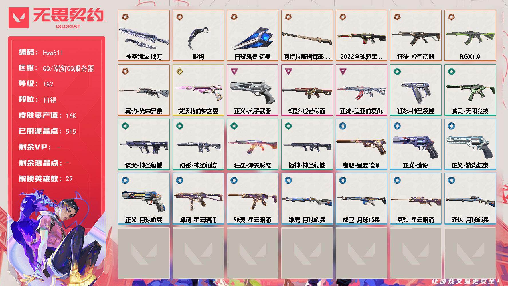 []13橙皮 1金皮 7紫皮 72皮肤 29英雄 118卡面 905已用源晶 白银段位 【近战武器皮肤】神圣领域 战刀,诡秘蛇影,日耀风暴 遗器,阿特拉斯指挥部,澄湖潋滟 【佩枪皮肤】正义-西部未来,标配-VCT25xTS,蒙太奇 狂怒,鬼魅-天界神兵 【步枪皮肤】幻影-归零者//