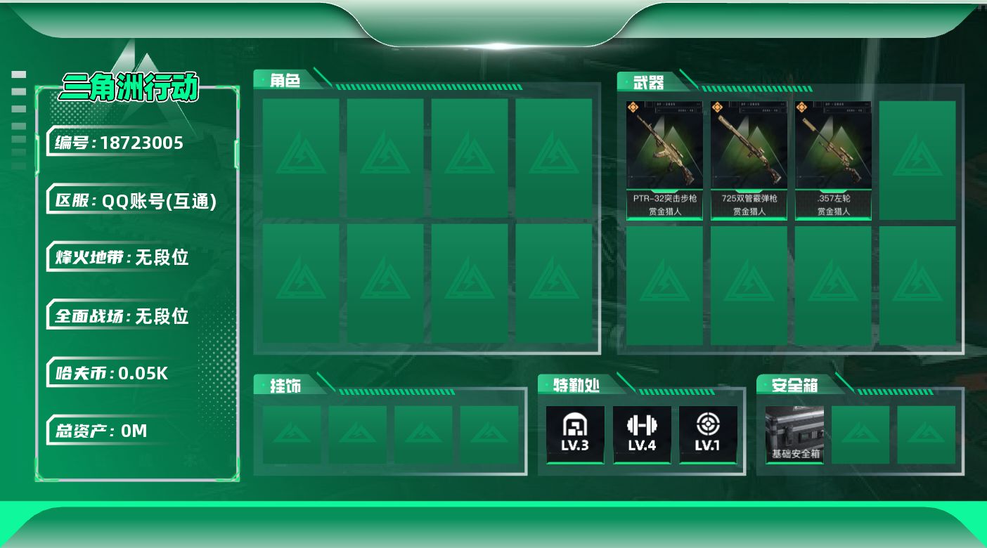 []总资产:83.5M 3传说枪械 哈夫币:55.563K 不可修改实名 无违规 【烽火地带段位】无段位 【全面战场段位】无段位 【传说武器皮肤】PTR-32突击步枪-赏金猎人,725双管霰弹枪-赏金猎人,357左轮-赏金猎人