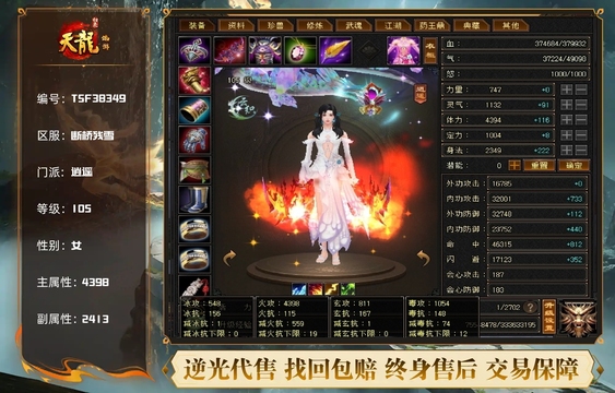 逍遥 | 等级:105 | 主属性:4398 | 副属性:2413 | 女 | 主火攻