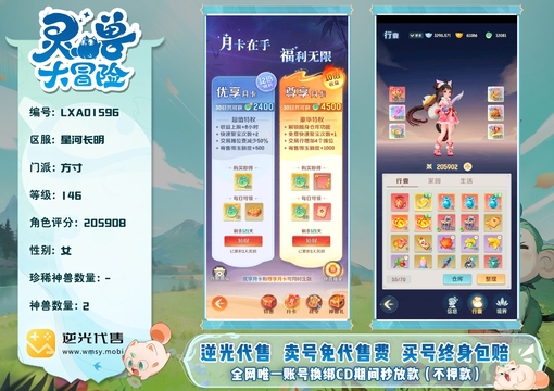 【LXA01596】 | 等级:146 | 仙器:5 | 神兽数量:2 | 角色评分:205908 | 方寸 | 女 | 画中仙、孙悟空 | 貔貅、龙马