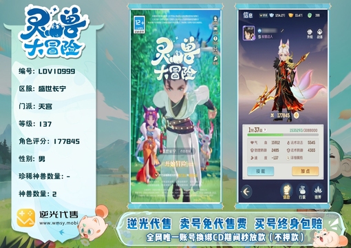 【LDV10999】 | 等级:137 | 仙器:6 | 神兽数量:2 | 角色评分:177845 | 珍兽数量:2 | 天宫 | 男 | 精卫 | 貔貅、龙马