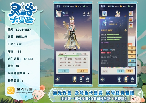【LDU14837】 | 仙器:6 | 神兽数量:2 | 珍兽数量:1 | 等级:133 | 角色评分:164323 | 天宫 | 男 | 精卫、画中仙 | 貔貅、龙马