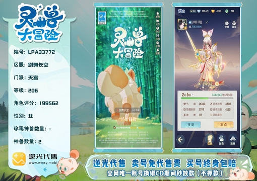 【LPA33772】 | 等级:206 | 仙器:4 | 神兽数量:2 | 角色评分:199562 | 珍兽数量:2 | 天宫 | 女 | 精卫、画中仙 | 貔貅、龙马