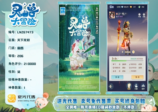 【LNZ67473】 | 等级:206 | 仙器:6 | 神兽数量:1 | 角色评分:210000 | 蛮岳 | 女 | 孙悟空 | 貔貅、龙马