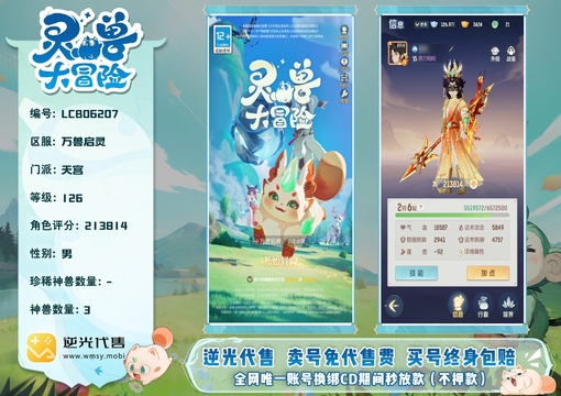 【LCB06207】 | 神兽数量:3 | 角色评分:213814 | 仙器:7 | 珍兽数量:2 | 等级:126 | 天宫 | 男 | 精卫、画中仙、孙悟空 | 貔貅、龙马