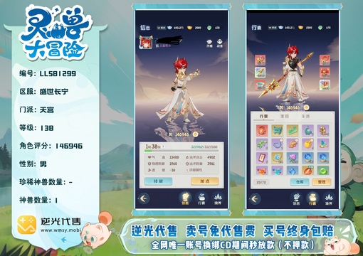 【LLS81299】 | 等级:138 | 仙器:2 | 角色评分:146946 | 神兽数量:1 | 天宫 | 男 | 精卫 | 貔貅