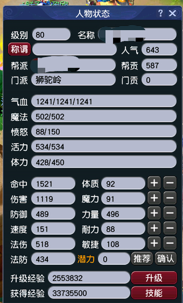89进度号女龙宫满技能,全身4段,变异攻宠一只配速两只,帮贡5600.剩余帮贡2600.帮派连续帮主可继续点修,强身60,烹饪69.养生40健身36.卡100人环未开。紫气豪宅一座。