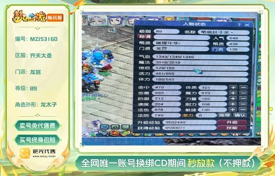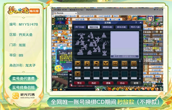 齐天两个89级龙宫,只剩下两个540绿通龙宫打包价格,本人一手号包一切,打造技能100级,为旭旭宝宝多次打造武器。人环全部已经卡好100环,开100等级可卖100人环机会,单次机会值600以上。出差没空玩,带一身陆小小装备和高驱狗,每天体活挂机赚钱,目前等级上限89,还没到赚钱时候,开100等级时日入可观,每天都在刷经验,人在外地此截图是比较早的图,低价亏本处理了。随便玩都回本了