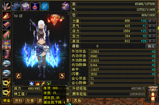 天山 | 等级:89 | 主属性:850 | 副属性:1 | 男 | 主冰攻 | VIP0