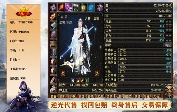 少林 | 等级:119 | 主属性:6456 | 副属性:733 | 主玄攻 | VIP3 | 畅游账号