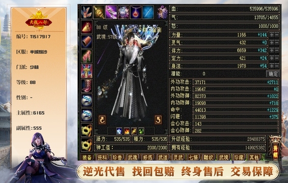 少林 | 等级:88 | 主属性:6165 | 副属性:555 | 主玄攻 | VIP6 | 畅游账号